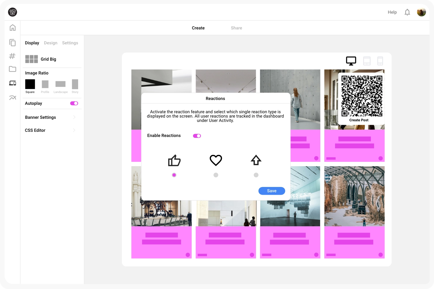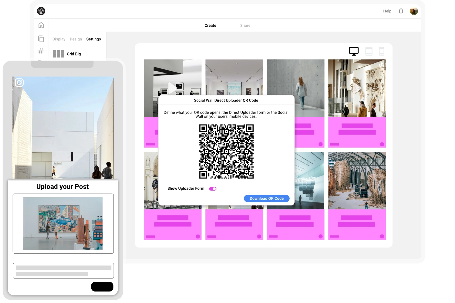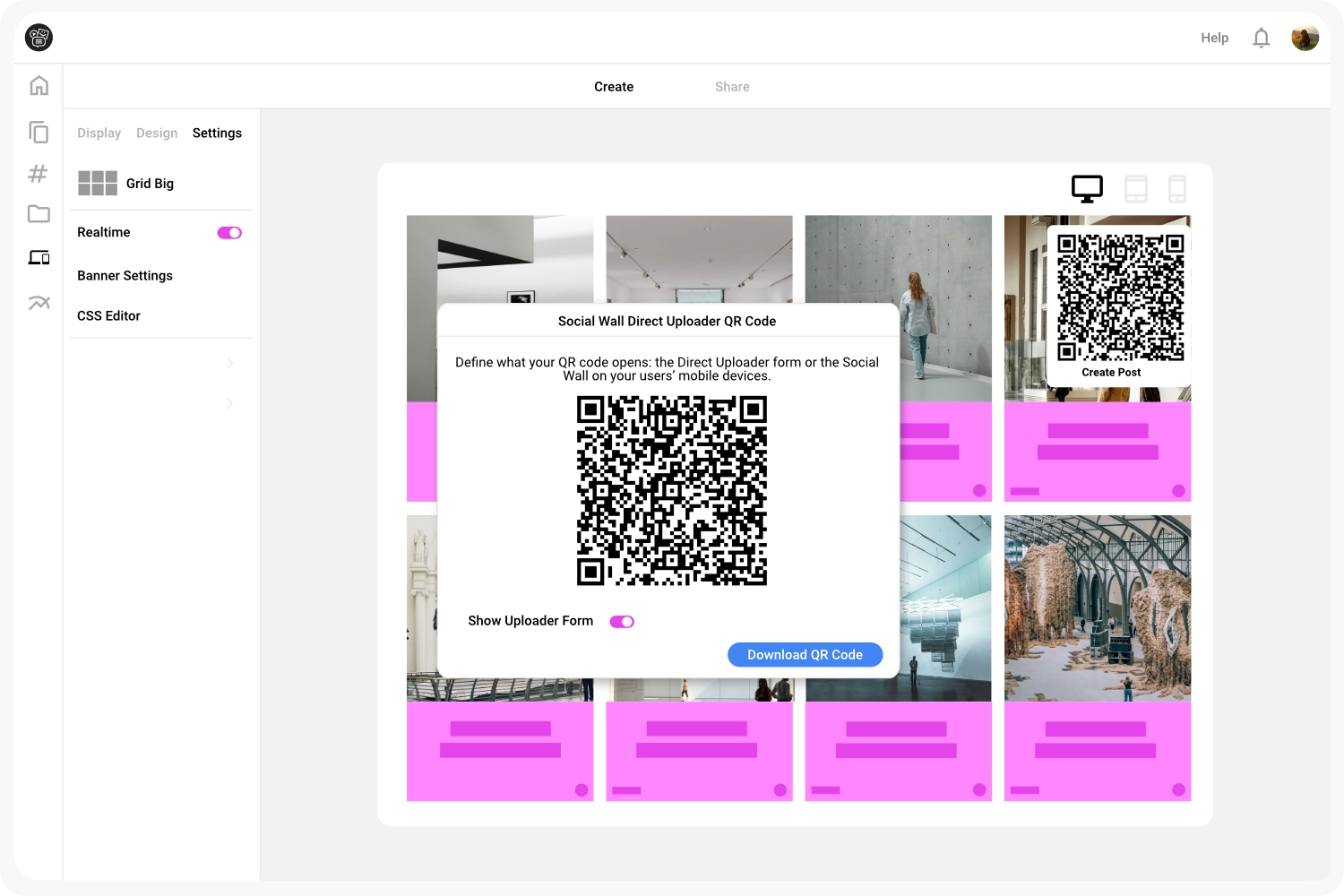 Customize the design of your social wall to match your corporate identity and activate the QR upload function with a single click. The system automatically generates a unique QR code to be displayed directly on the wall. You can also download the code to use on physical marketing materials like flyers, table stands, or posters.