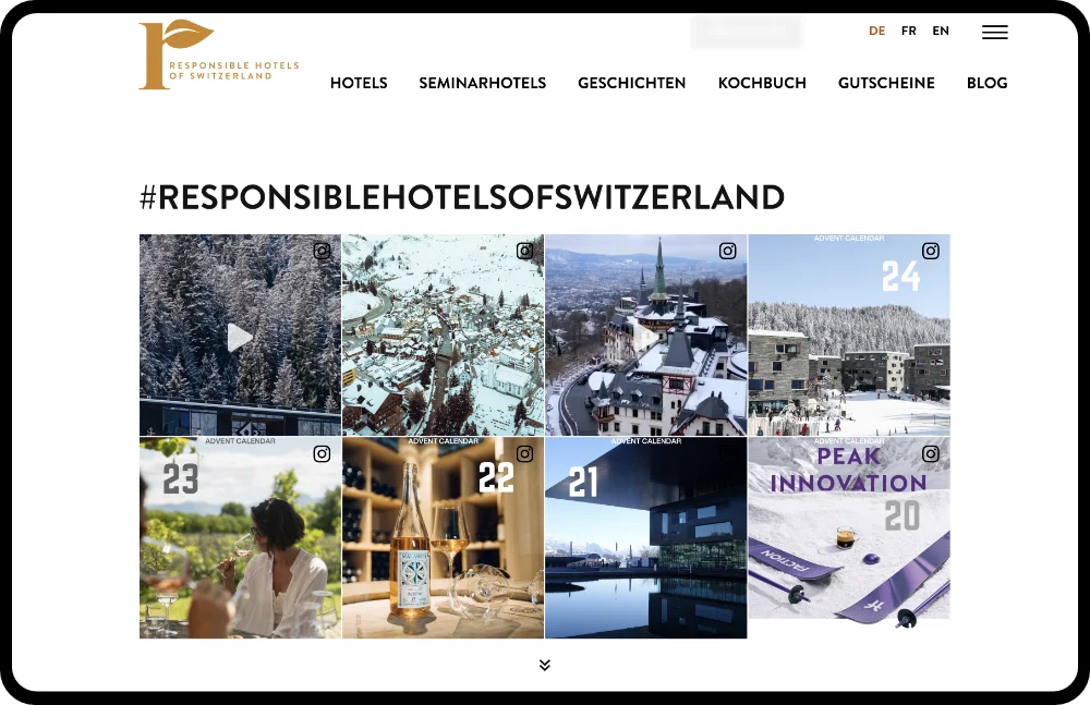 Jucker Farm’s experience farms are popular destinations for day trips, combining agriculture, gastronomy, and event venues into memorable visitor experiences. Visual and emotional storytelling is essential—particularly on the website, where inspiration meets information. Using contentfry, Jucker Farm integrates both its own social media content and curated user-generated content directly into its website. With features such as Themes and Storyboxes, content is filtered by topic and displayed precisely on the relevant subpages—for individual farms, events, or gastronomic offerings. This creates authentic, engaging content experiences that reflect real visitor impressions and showcase the diversity of Jucker Farm in a digital environment.